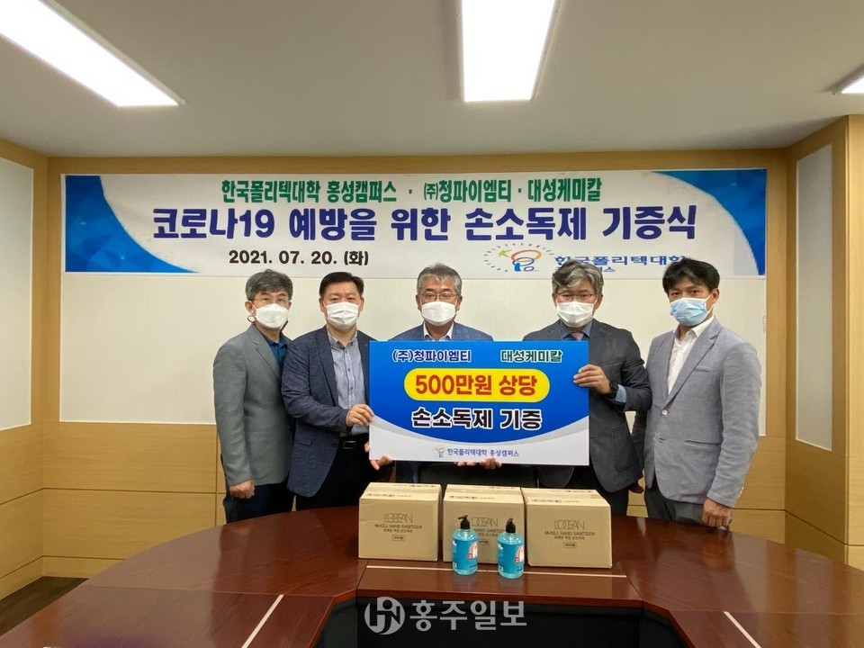 ㈜청파이엠티와 대성케미컬의 김진선 대표가 지난 20일에 한국폴리텍대학 홍성캠퍼스(학장 장우영)에 250만 원 상당의 손소독제를 기증했다.<사진>