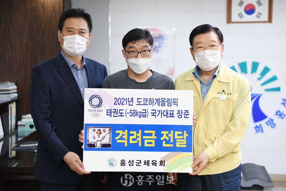 김석환 홍성군수와 백승균 홍성군체육회장은 지난 16일 홍성군청에서 태권도 국가대표 장준 선수의 부친인 장인수씨에게 금일봉을 전달하며 장 선수의 선전을 기원했다.<사진>