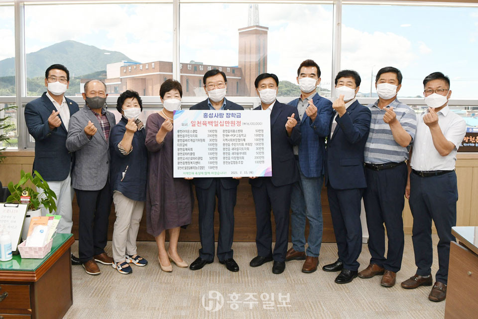 광천읍의 기관·기업 등 각계각층에서 지역발전의 초석이 될 인재양성에 힘을 보태고 있다. 지난 20일 광천읍의 적극적인 모금홍보로 마련한 1610만 원의 기금을 (재)홍성사랑장학회(이사장 김석환 홍성군수)에 장학금으로 기탁했다.<사진>
