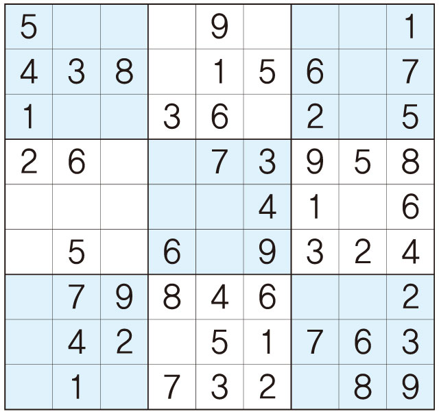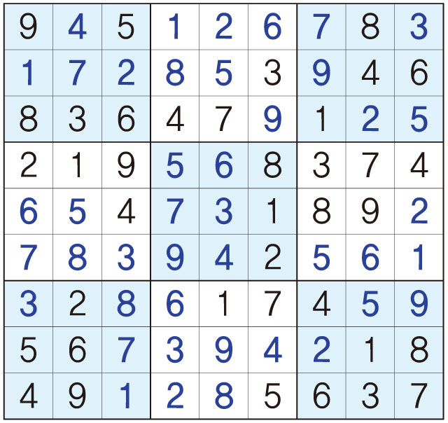 3. 큰 정사각형(9x9) 안에 있는 작은 정사각형(3x3) 안에는 숫자 1~9가 각 한 번씩 들어간다.