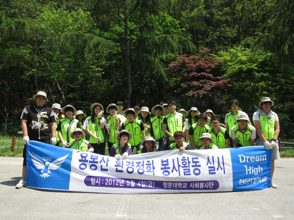 나눔과 배려를 실천하는 청운대학교(총장 이상렬) 사회봉사단은 지난 4일 홍성팔경 중 제1경인 용봉산에서 사회봉사단 담당자와 재학생 30명이 참석한 가운데 각종 쓰레기 수거 등 환경정화 봉사활동을 펼쳤다. 이번 행사는 어린이날을 맞아 다수의 관광객들이 용봉산을 찾을 것에 대비하여 사전에 환경정화 활동을 실시, 홍성을 찾은 방문객들에게 클린홍성의 모습을 선보이고, 지역사회에 봉사하는 청운대학교의 이미지를 심어주고자 했다.