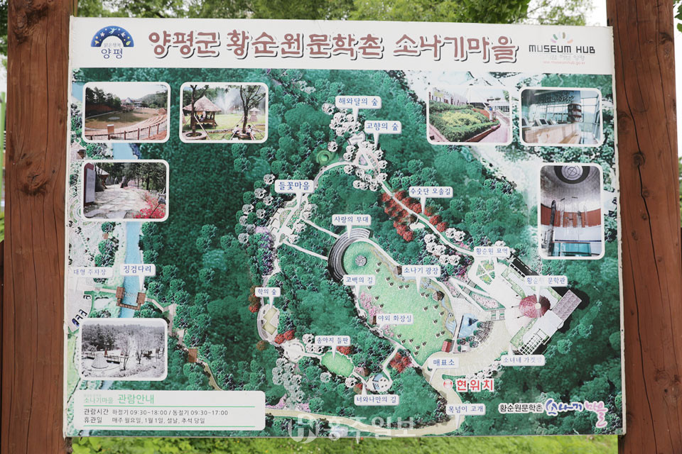 황순원문학촌 소나기마을은 경기도 양평군 서종면 수능리 341(서종면 소나기마을길24)에 위치한다. 북한강을 왼쪽으로 끼고 오르다가 문호리에서 지방도 352번을 타고 가다 보면 소나기 마을 표지판이 보인다. 작가가 교수로 재직했던 경희대학교와 양평군이 124억 원을 투입해 4만 7640㎡(약 1만 4000평)의 야산 부지에 3층짜리 문학관을 비롯해 황순원문학공원을 조성해 지난 2009년 9월부터 문을 열었다. 소나기마을에서 가장 먼저 봐야 할 곳은 역시 문학관이다. 황순원의 문학세계와 인생을 고스란히 되살려냈기 때문이다.