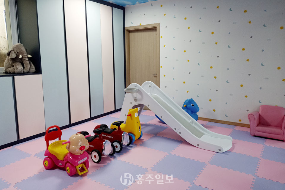 여성회관 1층에 위치한 공동육아나눔터는 자녀돌봄을 위한 안전한 공간을 마련하기 위해 안전매트를 시공했으며, 벽 블록 등 장난감과 도서를 비롯해 수유실, 기저귀갈이대 등 시설을 갖췄다.