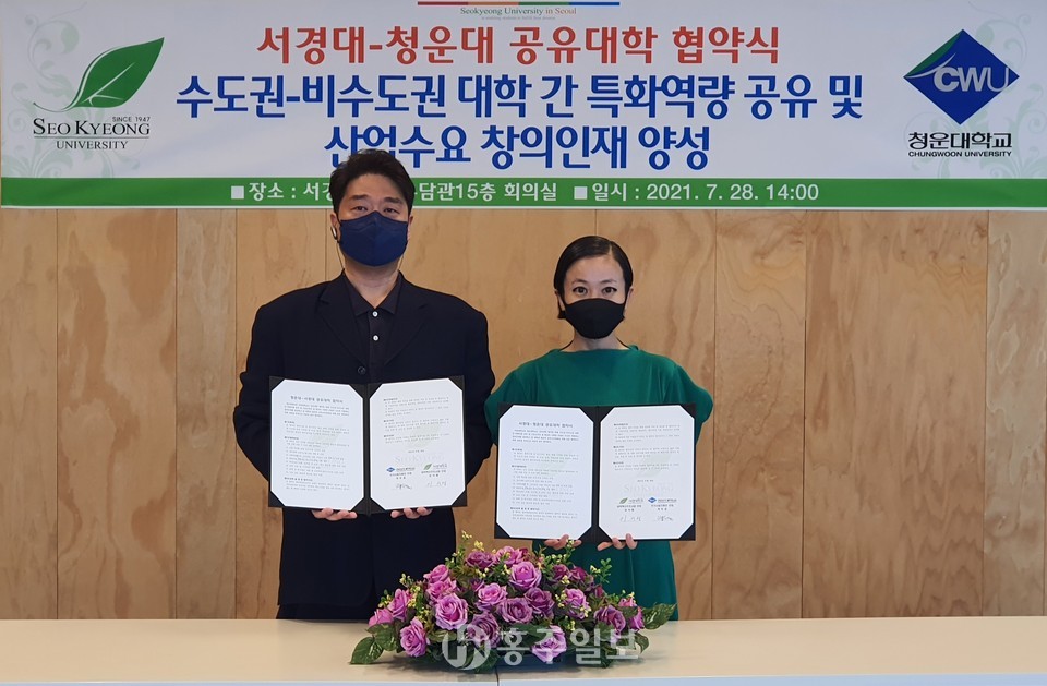 청운대학교(총장 이우종)와 서경대학교가 지난달 28일 공유대학을 구성·운영하기 위한 업무협약을 체결했다.<사진>