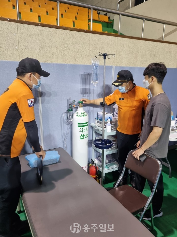 최근 이라크 소재 코로나19 치료병원에서 연이은 산소탱크 폭발 사고로 대규모 인명피해가 발생함에 따라 지난달 29일 박진규 옥암119안전센터장이 홍성군내 코로나19 예방접종센터인 홍주문화체육센터를 직접 방문해 화재안전 컨설팅을 실시했다.