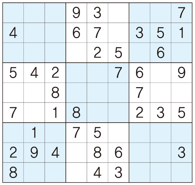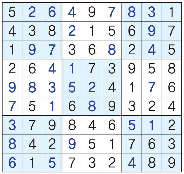 3. 큰 정사각형(9x9) 안에 있는 작은 정사각형(3x3) 안에는 숫자 1~9가 각 한 번씩 들어간다.