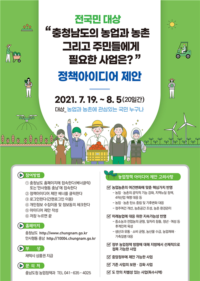 충남도가 전 국민을 대상으로 농업‧농촌에 대한 정책 아이디어를 수렴한다.