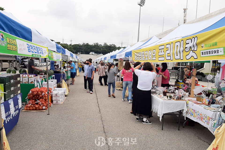 홍주종합경기장에서 매주 토요일마다 열리고 있는 ‘홍성사랑 희망장터’에 소비자들의 발길이 끊이지 않고 있다. 지난 5월 29일 드라이브스루 방식으로 개장한 장터는 현재 워킹스루 방식으로도 운영되고 있으며, 부스에서는 30여 곳의 농가와 소상공인들이 참여해 채소와 과일, 육류, 해산물, 과일잼, 수제청, 전통된장 등 홍성에서 생산된 다양한 품목들을 판매하고 있다.