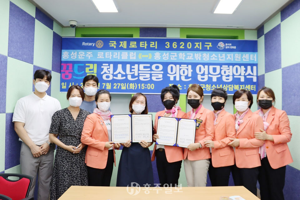 홍성군청소년지원센터 꿈드림(센터장 조현정는 국제로타리 3620지구 홍성운주 로타리클럽(회장 박선희)과 지난달 27일 꿈드림 센터에서 학교 밖 청소년들을 위한 업무협약식을 가졌다.<사진>