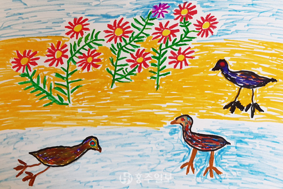 김길자 할머니는 처음에 그림방에 오셔서 그림을 그리지 않고 다른 할머니들이 그리는 것을 지켜보기만 하셨습니다. 그러다가 몇 회가 지난 뒤 그림을 여러 장 그려 오셨고 꽃을 그리셨지만 전혀 다른 꽃그림을 그려오셨습니다. 꽃으로 화면을 구성하는 방식과 색을 조합하는 방식이 아주 달랐던 것입니다. 여태까지 아무도 그리지 않은 맨드라미를 굳건하게 그리시고 맨드라미 주변에 잔 꽃잎이 흩날리는 모양으로도 그리셨는데 꽃 아래에서는 오리들이 물놀이를 하고 있었습니다. 오리들이 어찌나 편안하고 천진한지 웃음이 나왔습니다.