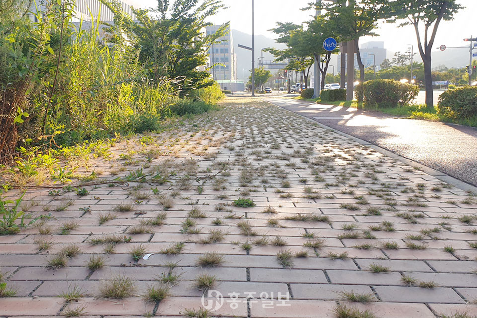 홍북읍 충남대로 인근 보행자도로에 무성하게 자란 잡초가 주민들에게 불쾌감을 주고 있다. 도로변 안쪽으로는 사람이 가까이 다가가기 어려울 정도로 수풀이 우거져 방치돼있다. 내포신도시 주민들은 “도로 틈으로 자라난 잡초가 미관상 좋지 않다”, “도로 사이로 촘촘하게 자라난 게 징그럽다. 어서 깔끔하게 정리됐으면 좋겠다”는 등 불쾌감을 호소하고 있다. 황희재 기자