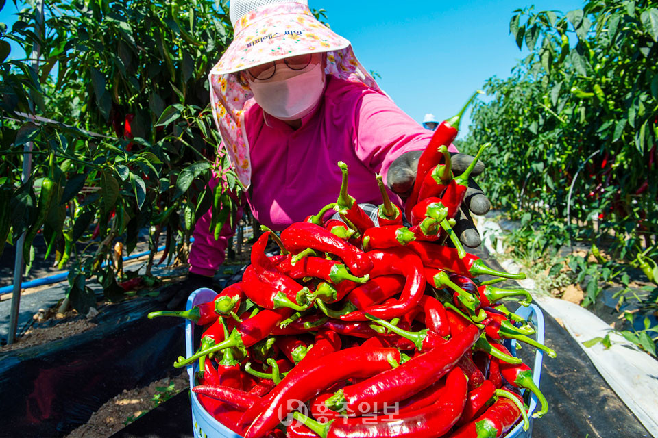 홍성군농업기술센터(소장 윤길선)가 결성면 교촌마을 고추작목반과 함께 ‘막덮기 부직포 터널’재배방식을 적용해 높은 품질의 고추를 수확하고 있다.