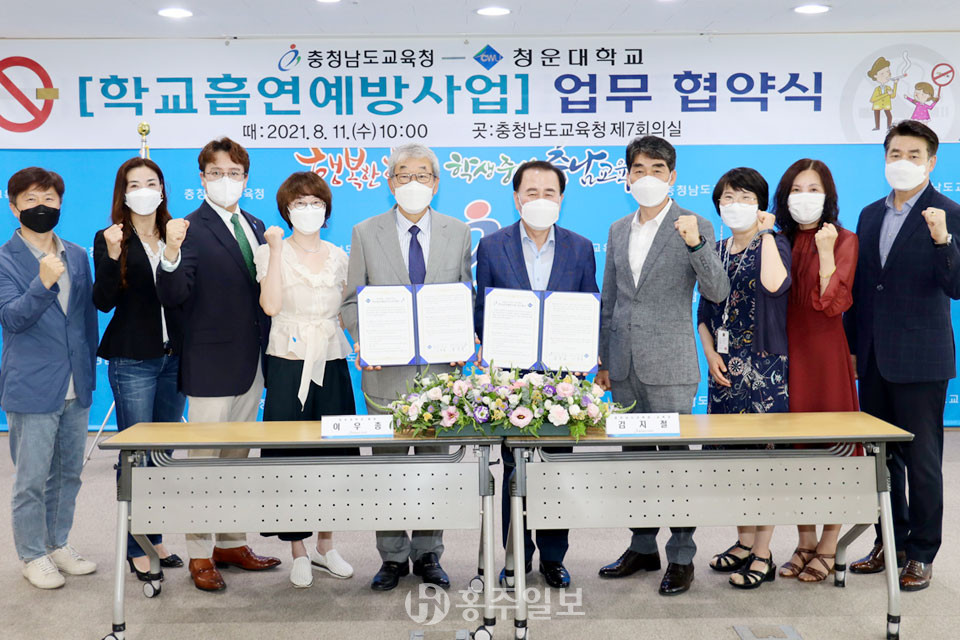 청운대학교(총장 이우종)와 충남교육청(교육감 김지철)은 지난 11일 충남교육청 7층 회의실에서 ‘학교 흡연 예방 사업’을 위한 업무협약을 체결했다.<사진>