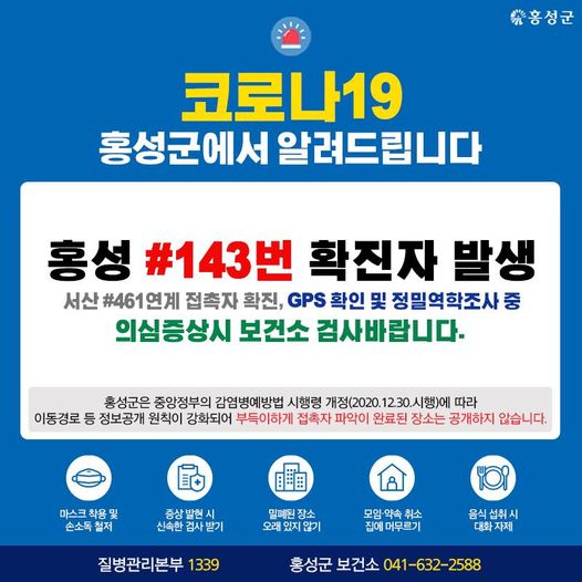 확진자 1명(#홍성143번) 발생 서산 #461번 접촉자, 이동선별진료소 운영 검사 #CCTV_및_정밀역학_조사_중 수도권 방문 · 지인 만남 자제 바랍니다. Tag #홍성군 #코로나19 #확진자 #발생 #역학조사 중 저작권자 © 홍주일보 무단전재 및 재배포 금지 한기원 기자 다른기사 보기 페이스북 카카오톡 URL복사 기사공유하기