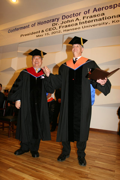 함기선 한서대 총장은 지난 15일 태안캠퍼스에서 미 프라스카 인터내셔널사 존 앤소니 프라스카 회장에게 명예 항공공학박사 학위를 수여했다. 프라스카 회장은 한서대에 교육용 보잉737 LOFT 시뮬레이터를 기증하는 등 항공분야에서의 협력증진에 노력한 공로다.