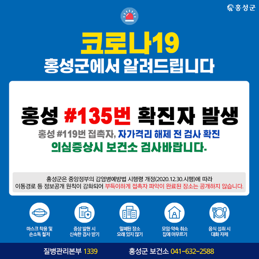 홍성 #135번 확진자 발생 - 홍성 #119번 접촉자. 자가격리 해제 전 검사 확진 - 타지역 방문후 의심증상시 보건소 선별진료소에서 검사바랍니다. Tag #홍성군 #코로나19 #확진자 저작권자 © 홍주일보 무단전재 및 재배포 금지 한기원 기자 다른기사 보기 페이스북 카카오톡 URL복사 기사공유하기