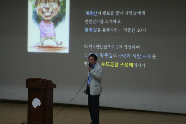 강연자는 (주)선양소주 조웅래 회장으로 계족산 황톳길을 사례로 들어 ‘맨발로 걷는 즐거움’이란 주제로 90분간 강연을 진행했다.