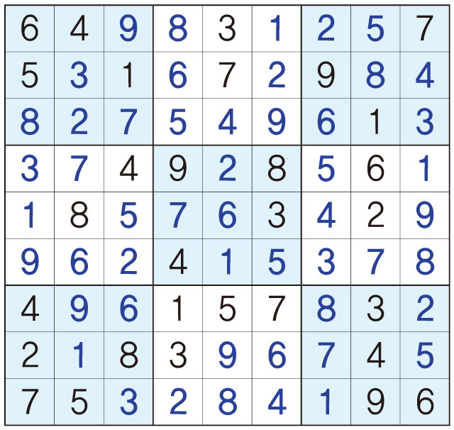 3. 큰 정사각형(9x9) 안에 있는 작은 정사각형(3x3) 안에는 숫자 1~9가 각 한 번씩 들어간다.