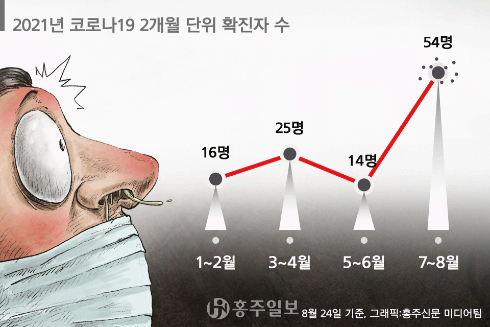 그러나 지난 23일 기준 7월과 8월 단 2개월 간 홍성에서 코로나19 감염을 확진 받은 사람의 수는 올해 누적 확진자 수(109명)의 50%가량을 차지하는 54명으로 나타나 지역사회 전반에 걸쳐 긴장이 고조되고 있다.