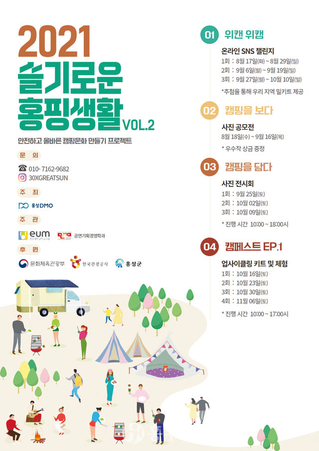 홍성DMO사업단의 ‘슬기로운 홍핑생활 VOL.2’는 안전여행 캠핑을 목적으로 진행되는 챌린지 프로젝트로 작년에 진행된 ‘슬기로운 홍핑생활 VOL.1’을 공연기획경영학과 학생들이 새로 기획한 것으로 알려졌다.
