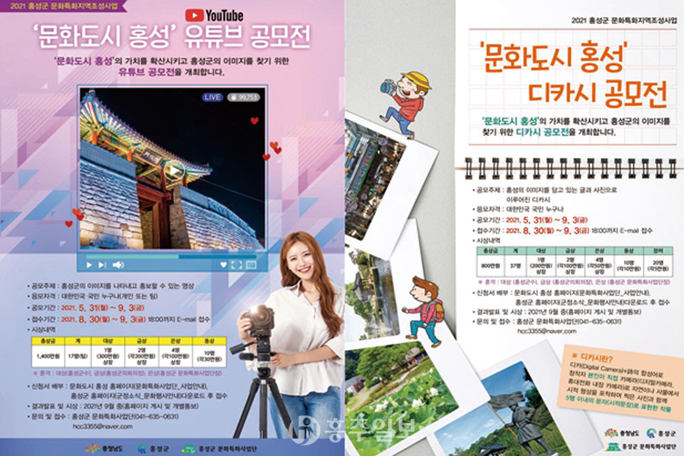 홍성군 문화특화지역조성사업 추진사업단(이하 사업단)이 ‘유튜브 공모전’과 ‘디카시 공모전’을 개최한다.
