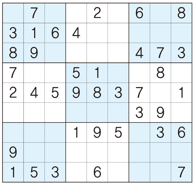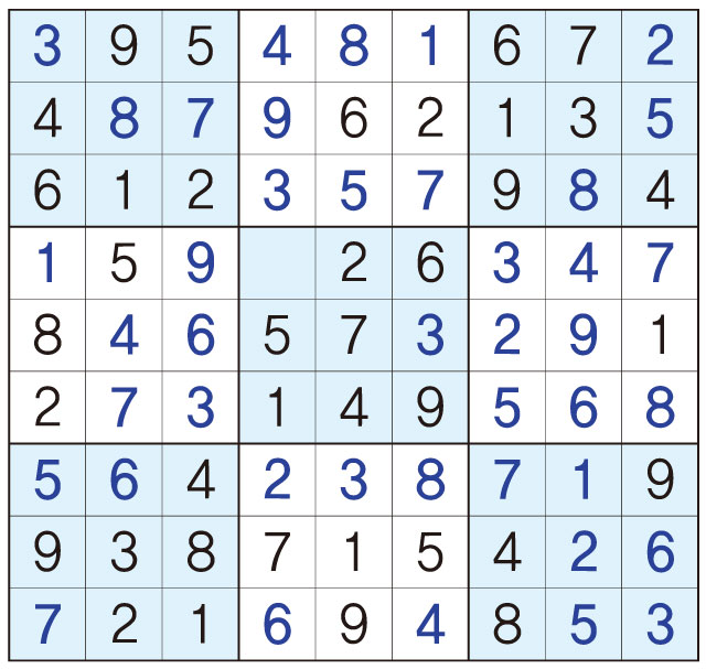 3. 큰 정사각형(9x9) 안에 있는 작은 정사각형(3x3) 안에는 숫자 1~9가 각 한 번씩 들어간다.