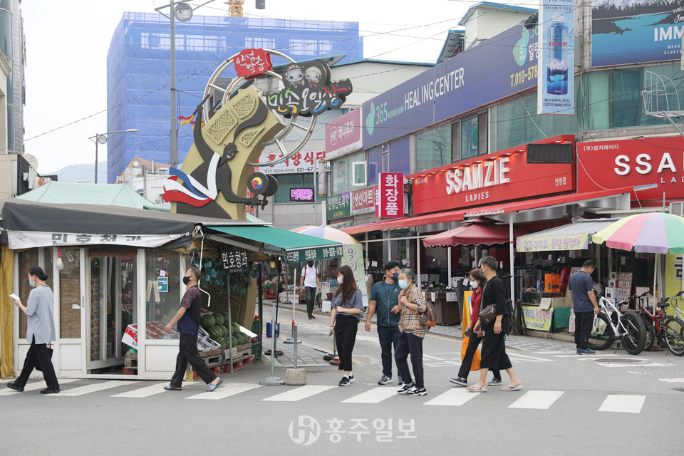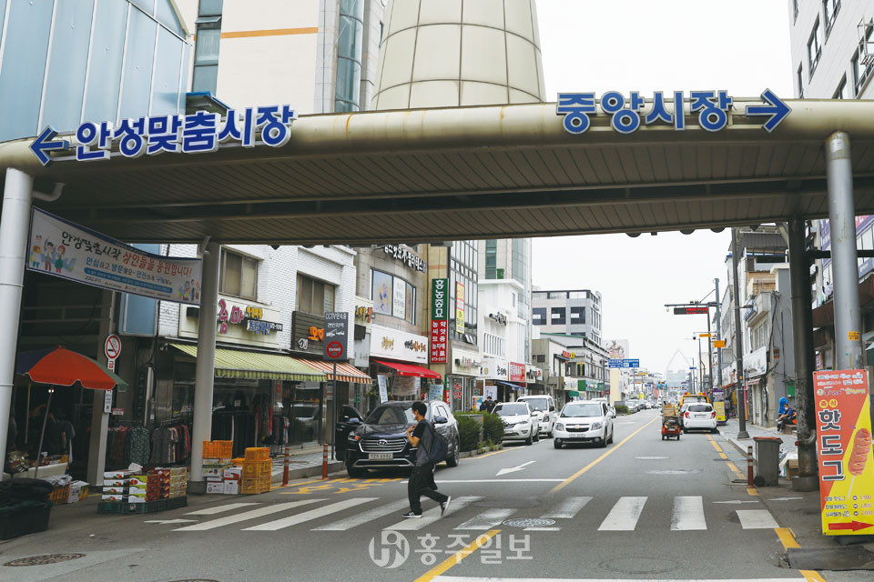 코로나19시대, 마스크를 쓴 행인들이 노점을 둘러보고 중앙시장 아케이드 안으로 발길을 옮기고 있다. 아케이드 안은 추억이 깃든 골목처럼 보인다. 빛바랜 회색건물, 옹기종기 붙은 간판들, 그 위로 거리등과 함께 걸린 원형의 안성시 마스코트 ‘바우덕이’ 캐릭터가 눈에 들어온다. 상점과 상점 사이에 놓인 길 한가운데에는 농산물을 파는 노점들도 있다. 아케이드 안의 저잣거리에는 장을 보기 위해 나온 행인들의 발길이 분주하다.