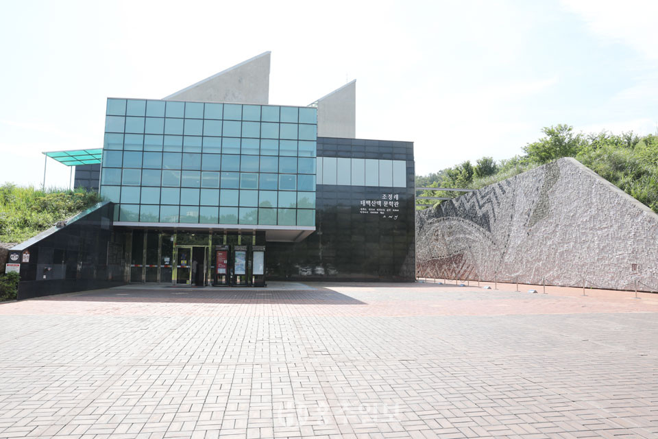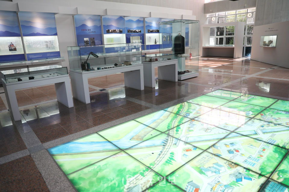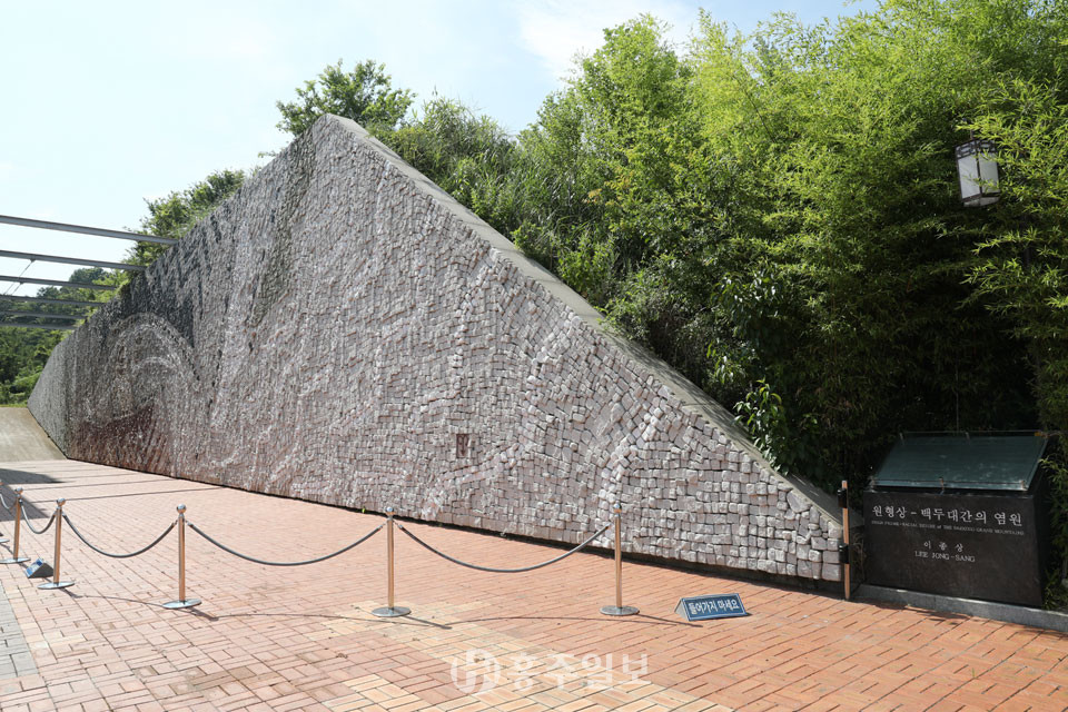전시실 1층의 통유리 너머로 바라보이는 벽화는 압권이다. 충남 예산출신의 한국화가 이종상 화백의 오방색 자연석 벽화는 높이 8m, 폭 81m의 ‘원형상-백두대간의 염원’이라는 소설이 상징하는 것만큼이나 웅장하면서도 다채롭다. 모두 4만여 개 몽돌로 제작한 옹석벽화는 지리산부터 백두산까지 몽돌을 수집해 만들었다는 설명이다. 우리 민족이 겪은 질곡의 역사를 극복하고 지구상에 마지막 남은 분단의 아픔을 종식하는 통일의 간구를 고구려 고분 벽화의 모자이크 기법으로 표현했다. 소설 태백산맥의 문학성을 높이고 민족의 염원인 통일을 건축적 언어로 담아낸 건물을 서로 보완하고 도움으로써 문학과 건축과 미술이 조화를 이룬 최대의 옹석벽화다. 민족의 염원이 투영된 벽화는 소설이 궁극적으로 지향하는 세계를 담아내고 있다.