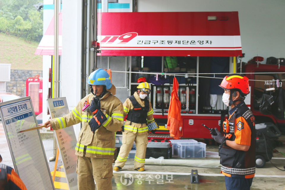홍성소방서(서장 김성찬)는 지난 25일 홍성소방서 1층 차고에서 재난상황별 대응능력향상을 위한 긴급구조통제단 불시 가동 훈련을 실시했다.<사진>