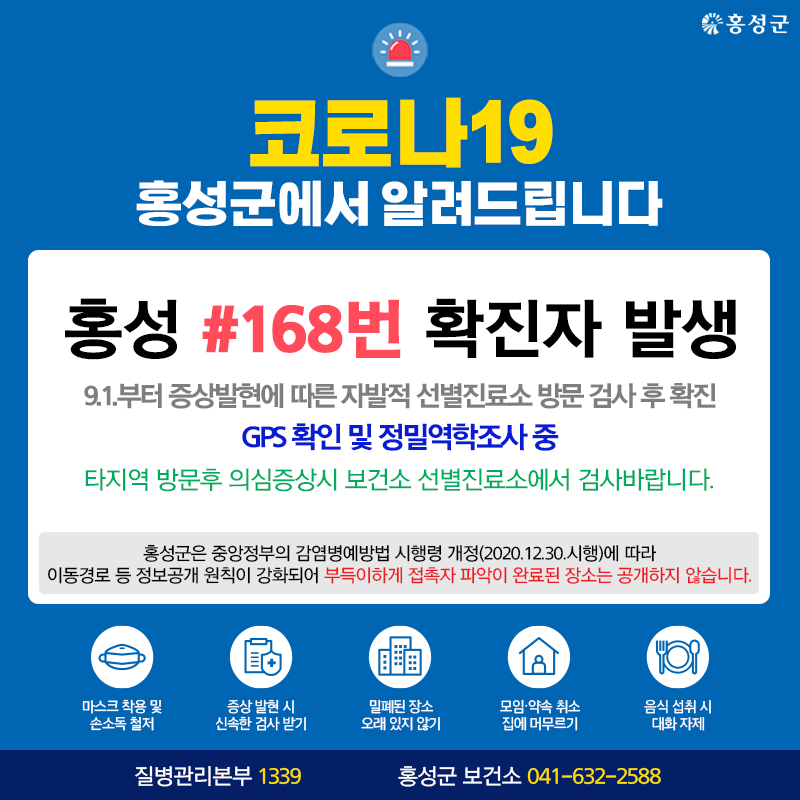 홍성 #168번 확진자 발생 - 9.1.부터 증상발현에 따른 자발적 선별진료소 방문 검사 후 확진 - CCTV 확인 및 정밀 역학 조사 중 Tag #홍성군 #코로나19 #확진자 #발생 저작권자 © 홍주일보 무단전재 및 재배포 금지 한기원 기자 다른기사 보기 페이스북 카카오톡 URL복사 기사공유하기