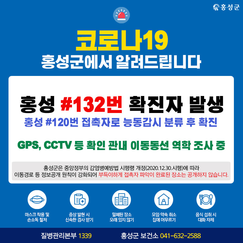 홍성 #132번 확진자 발생 - 홍성 #120번 접촉자로 능동감시 분류 후 확진 - GPS, CCTV 등 확인, 관내 이동동선 역학 조사 중 Tag #홍성군 #코로나19 #확진자 #발생 저작권자 © 홍주일보 무단전재 및 재배포 금지 한기원 기자 다른기사 보기 페이스북 카카오톡 URL복사 기사공유하기