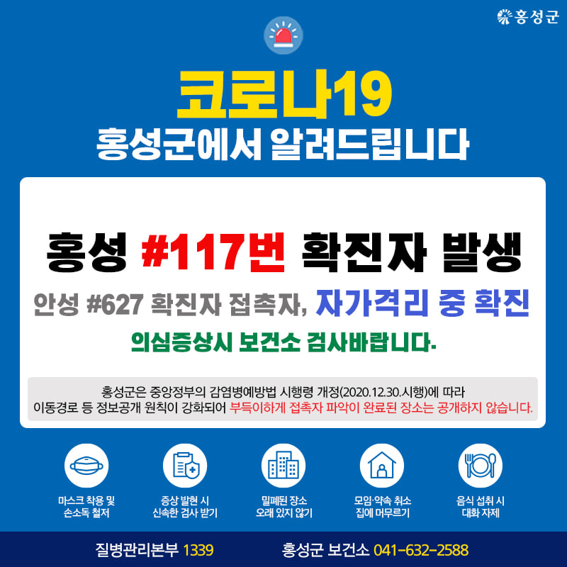 7월 22일(목) 17시 기준 확진자 1명(홍성 #117번) 발생 안성 #627확진자 접촉자, 자가격리 중 확진 수도권 방문 · 지인 만남 자제 바랍니다. Tag #홍성군 #코로나19 #확진자 #발생 저작권자 © 홍주일보 무단전재 및 재배포 금지 한기원 기자 다른기사 보기 페이스북 카카오톡 URL복사 기사공유하기