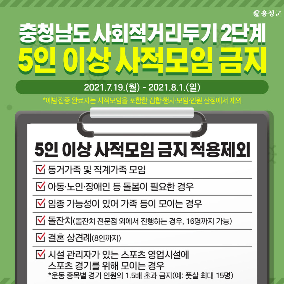 충청남도 사회적 거리두기 2단계 5인 이상 사적모임 금지