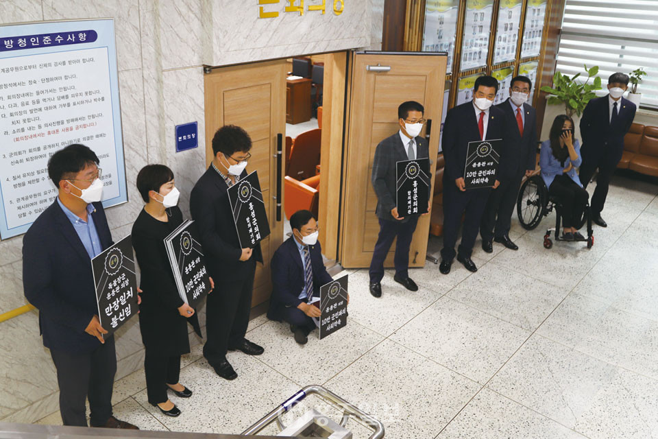 군의원들 ‘보이콧’… 본회의장 입구서 피켓 시위 진행