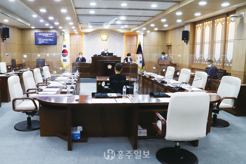 홍성군의회(의장 윤용관)에서 윤용관 의장과 군의원 10명간의 대립이 격해지며 임시회 향후 일정이 오리무중이다.
