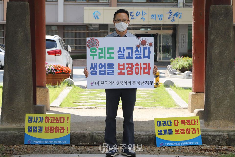 (사)한국외식업중앙회 홍성군지부(지부장 민재식)는 지난 3일 홍성군청 앞에서 ‘외식업 생존권 사수를 위한 전국 동시 1인 릴레이 시위’ 추진했다.