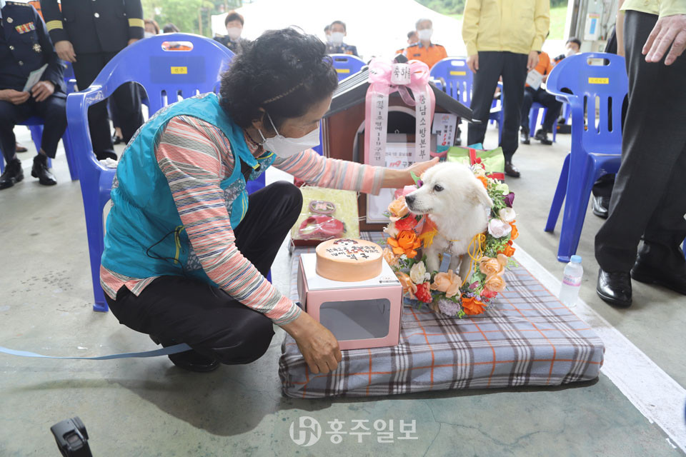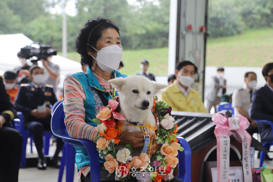 40시간 만에 90세 치매 할머니의 생환을 이끌었던 ‘백구’가 견주 심금순(65) 씨, 양승조 도지사, 이계양 안전건설소방위원회 위원장 등 내·외빈 40여 명이 참석한 가운데 지난 6일 전국 1호 충남 소방 ‘명예119 구조견’에 임명됐다.