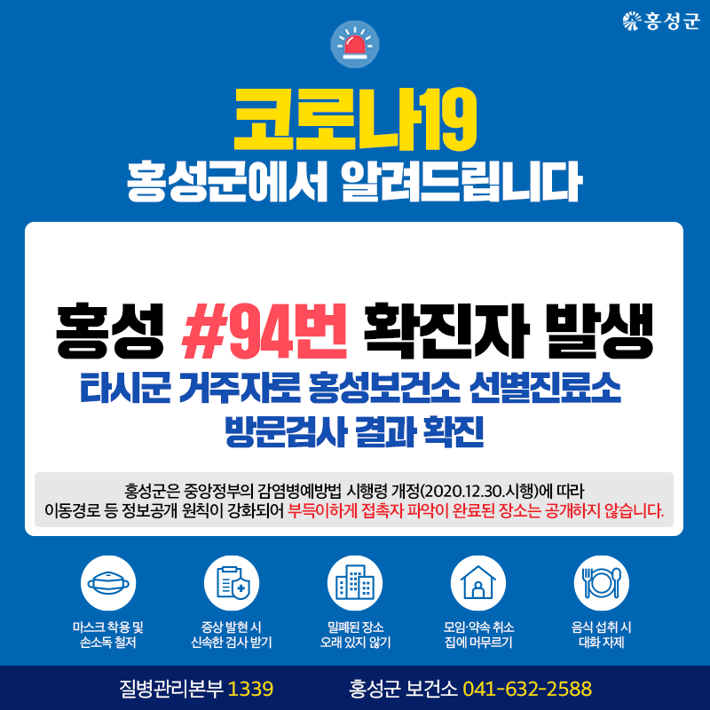 홍성 #94번 확진자 발생 타시군 거주자로 홍성보건소 선별진료소 방문검사 결과 확진. 방역수칙 준수바랍니다. Tag #홍성군 #코로나19 #확진자 #발생 저작권자 © 홍주일보 무단전재 및 재배포 금지 한기원 기자 다른기사 보기 페이스북 카카오톡 URL복사 기사공유하기