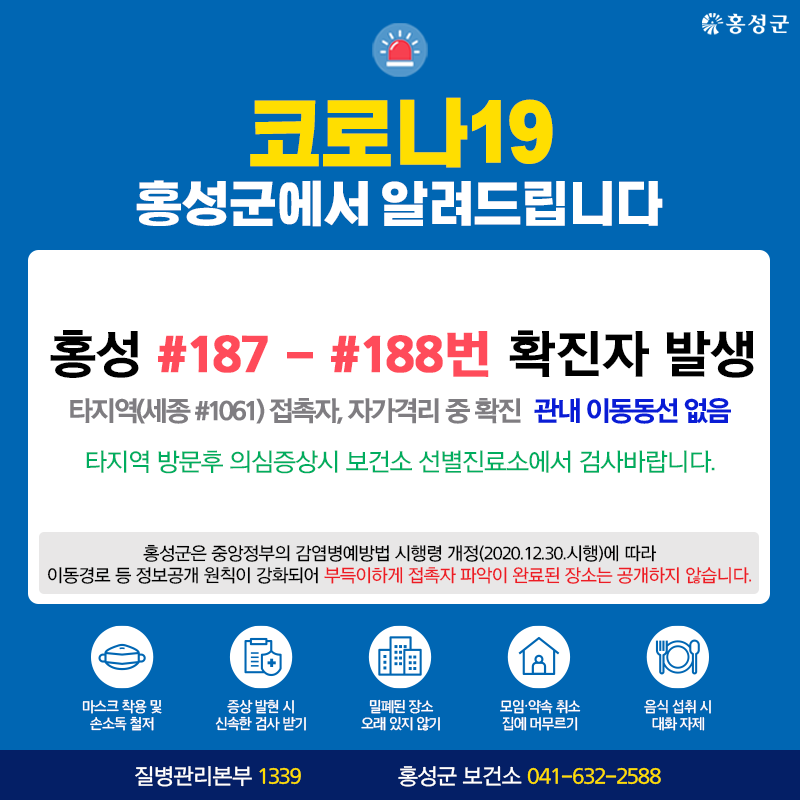 홍성 #187 - #188번 확진자 발생 - 타지역(세종 #1061) 접촉자, 자가격리 중 확진 - 관내 이동동선 없음 Tag #홍성군 #코로나19 #확진자 #2명 #발생 저작권자 © 홍주일보 무단전재 및 재배포 금지 한기원 기자 다른기사 보기 페이스북 카카오톡 URL복사 기사공유하기