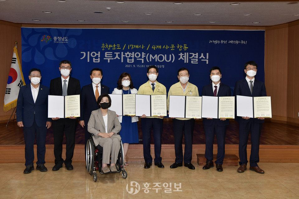 홍성군(군수 김석환)이 15일 ㈜비케이, ㈜이에스테크인터내셔널, ㈜엠피알브레인, 에이치엠오건강드림 영농조합법인 등 4개 기업과 232억 규모의 합동투자협약(MOU)을 체결했다.<사진>