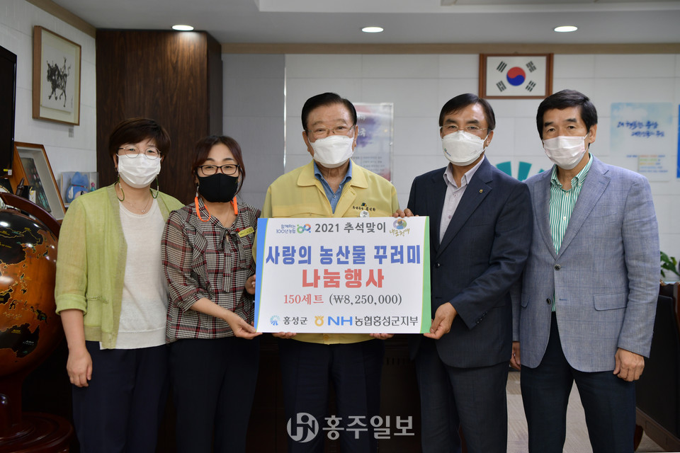 NH농협 홍성군지부(지부장 윤용주)는 지난 16일 홍성군청을 방문해 추석맞이 ‘사랑의 농산물 꾸러미’ 나눔 행사를 실시했다.<사진>