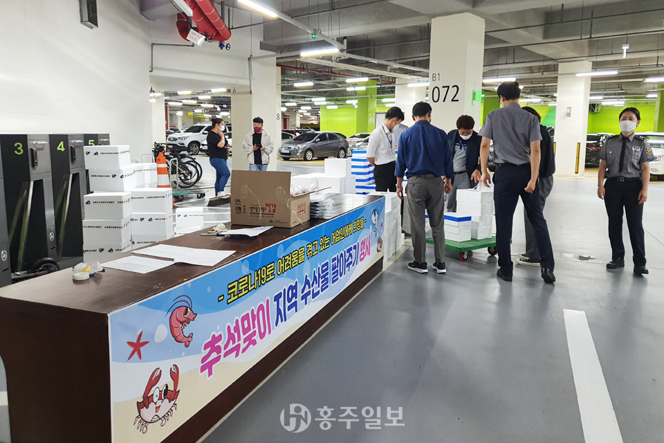 충남도는 지난 17일 추석을 맞아 도청에서 직원들을 대상으로 ‘지역 수산물 팔아주기’ 행사를 추진했다.<사진>