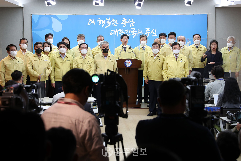 양승조 지사는 지난 27일 도청 프레스센터에서 기자회견을 열고 “정부 상생국민지원금 지원 대상에서 제외된 도민들에게도 재난지원금을 지급키로 결정했다”고 밝혔다. 이날 기자회견에는 김석환 홍성군수, 윤용관 홍성군의회 의장 등 9개 시군 시장·군수, 10개 시군의회 의장 등이 참석, 상생국민지원금 전 도민 지급에 대한 의지를 밝혔다.<사진>