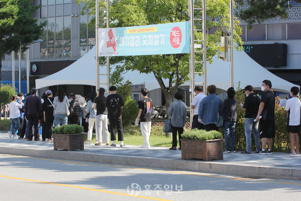 추석 연휴 지역 간 이동으로 코로나19 확산이 우려되는 가운데, 연휴가 끝난 지난 24일 홍성군보건소 입구에 마련된 선별진료소에는 코로나19 감염여부를 확인하기 위해 진료소를 방문한 많은 군민들이 길게 줄지어 서있었다.<사진>