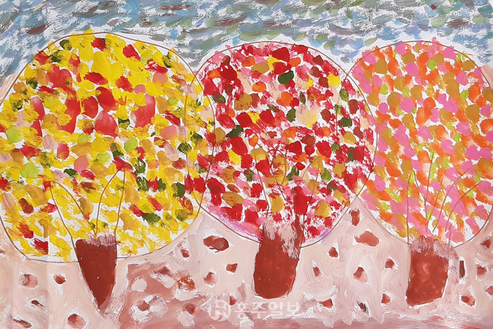 임문자 어르신의 가을 나무는 회색빛 하늘을 머리에 이고 있습니다. 파란 하늘보다 오히려 가을의 우수 같은 게 느껴지는 하늘빛입니다. 흰색을 섞으니 색조가 더욱 풍부해졌습니다. 회색조 하늘 아래서 노랑, 빨강, 주홍으로 물든 나무는 더욱 곱고 사랑스럽습니다. 나무 아래에는 가랑잎이 성글게 떨어져 있습니다. 아직 깊은 가을은 아닌 것 같습니다. 낙엽이 떨어진 분홍색 바닥을 단풍 향기 맡으며 걸어보고 싶었습니다.