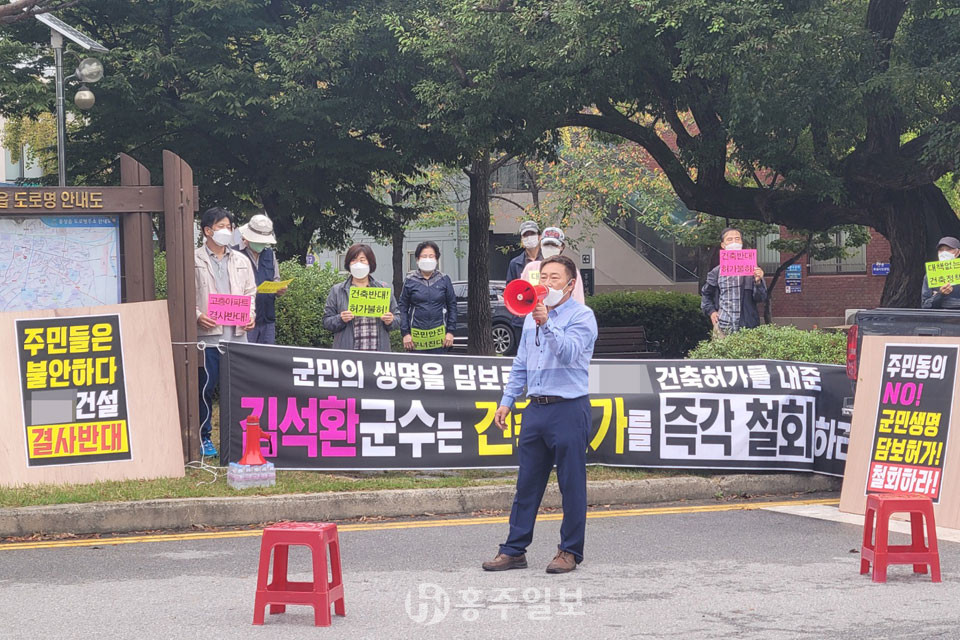 남장리 인근 단독주택 일부 주민들은 지난 23일 홍성군청 앞에서 아파트 건설사와 홍성군을 비판하는 집회를 가졌고, 28일에는 공사장 인근 아파트와 단독 주택 주민 10여 명이 군청 앞에서 집회를 열었다.<사진>
