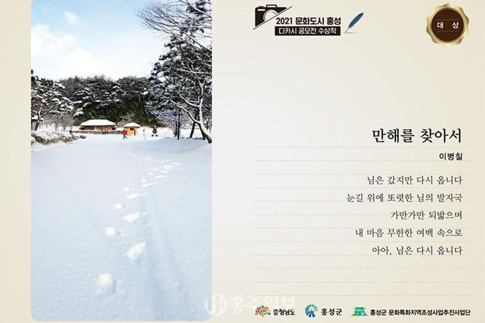 홍성군 문화특화사업단(이하 사업단)이 개최한 ‘2021년 제2회 문화도시 홍성 디카시 공모전’에서 지역 내 거주하는 이병칠 씨의 작품 ‘만해를 찾아서’가 영예의 대상을 차지했다.