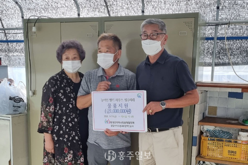 홍성군지역사회보장협의체가 지난날 집중호우로 수해 피해를 입은 농아인 딸기재배 사업장에100만 원 상당의 물품을 지원했다.<사진>