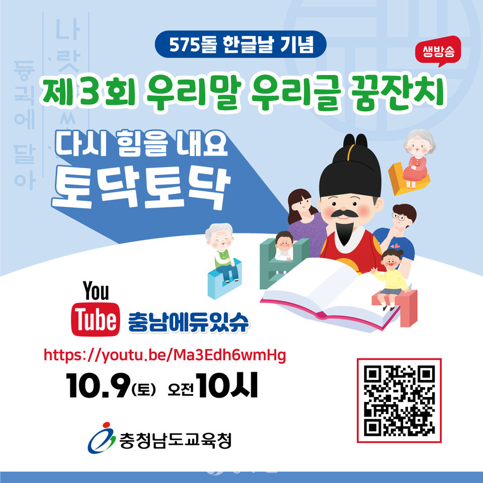 한글날인 10월 9일에는 기념식과 함께 한글사랑 유공자에 대한 교육감 표창, 충남교육 한글사랑 공모전 우수작 시상을 한다. 이어 풍물, 연극, 모래예술 공연과 함께 ‘제3회 우리말 우리글 꿈잔치’를 개막한다. 본행사로 대담과 퀴즈로 꾸며진 특별생방송을 충남교육청 유튜브 채널 ‘에듀있슈(https://youtu.be/Ma3Edh6wmHg)’를 통해 송출한다.