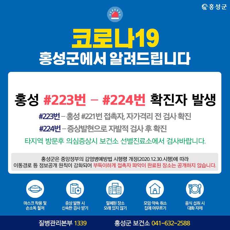 #223번 – 홍성 #221 접촉자, 자가격리 전 검사 후 확진